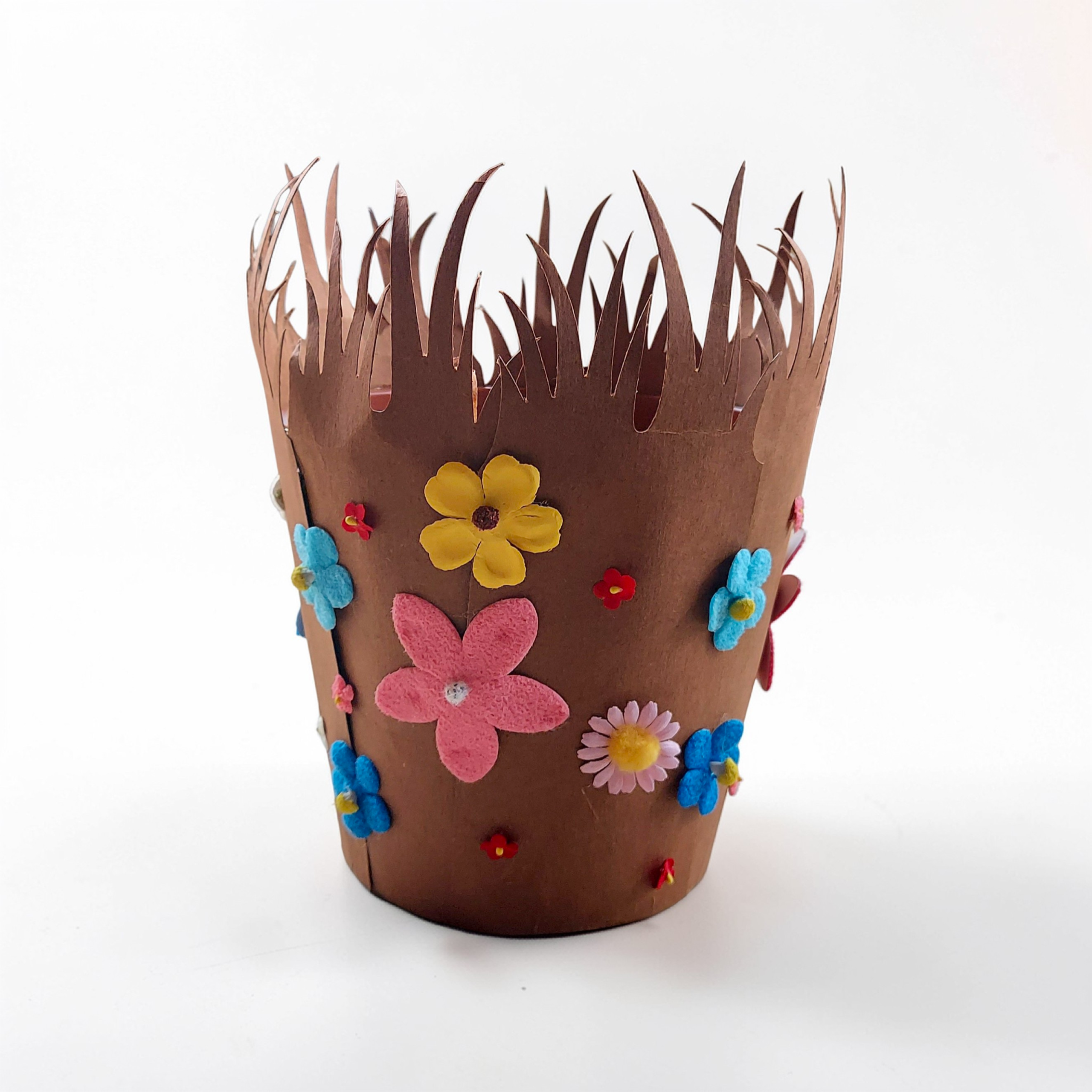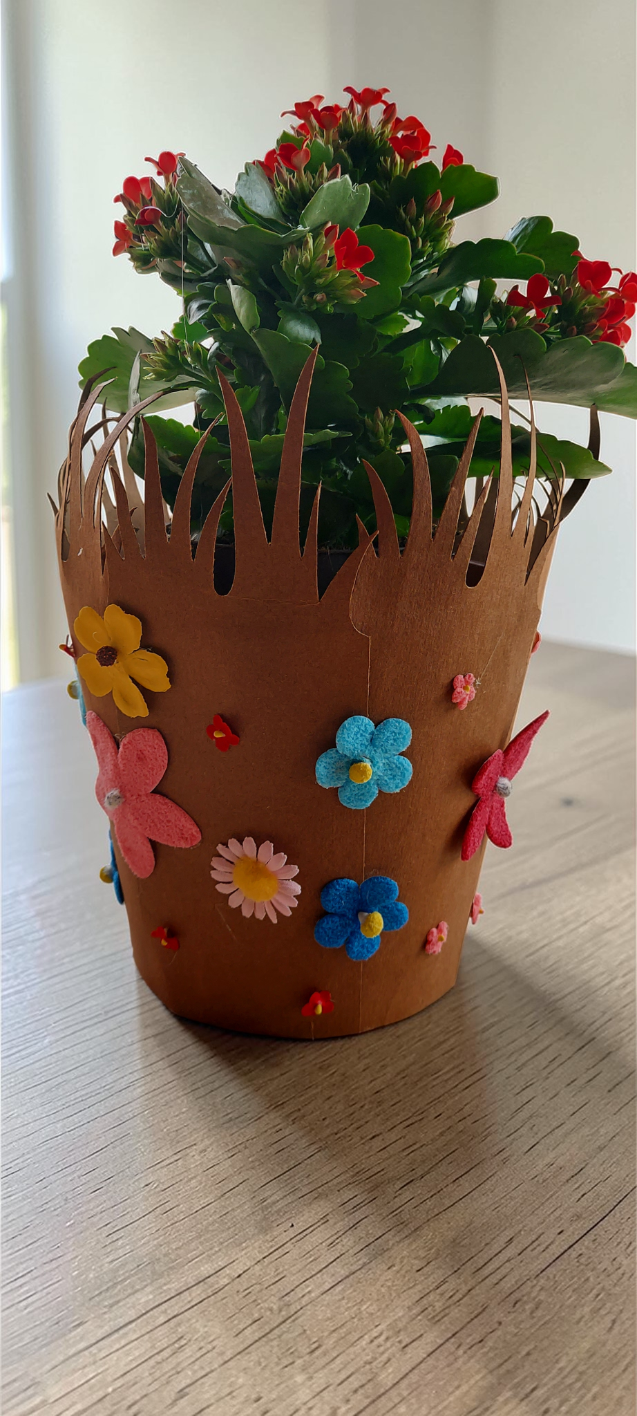 Die Kartonzuschnitte werden einfach um den Topf gelegt und mit etwas Kleber fixiert (z. B. Heißkleber) – schon entsteht die perfekte Grundlage für deine Gestaltung. Anschließend kannst du die bunten künstlichen Blumen nach Lust und Laune anbringen und deinen eigenen Stil umsetzen.