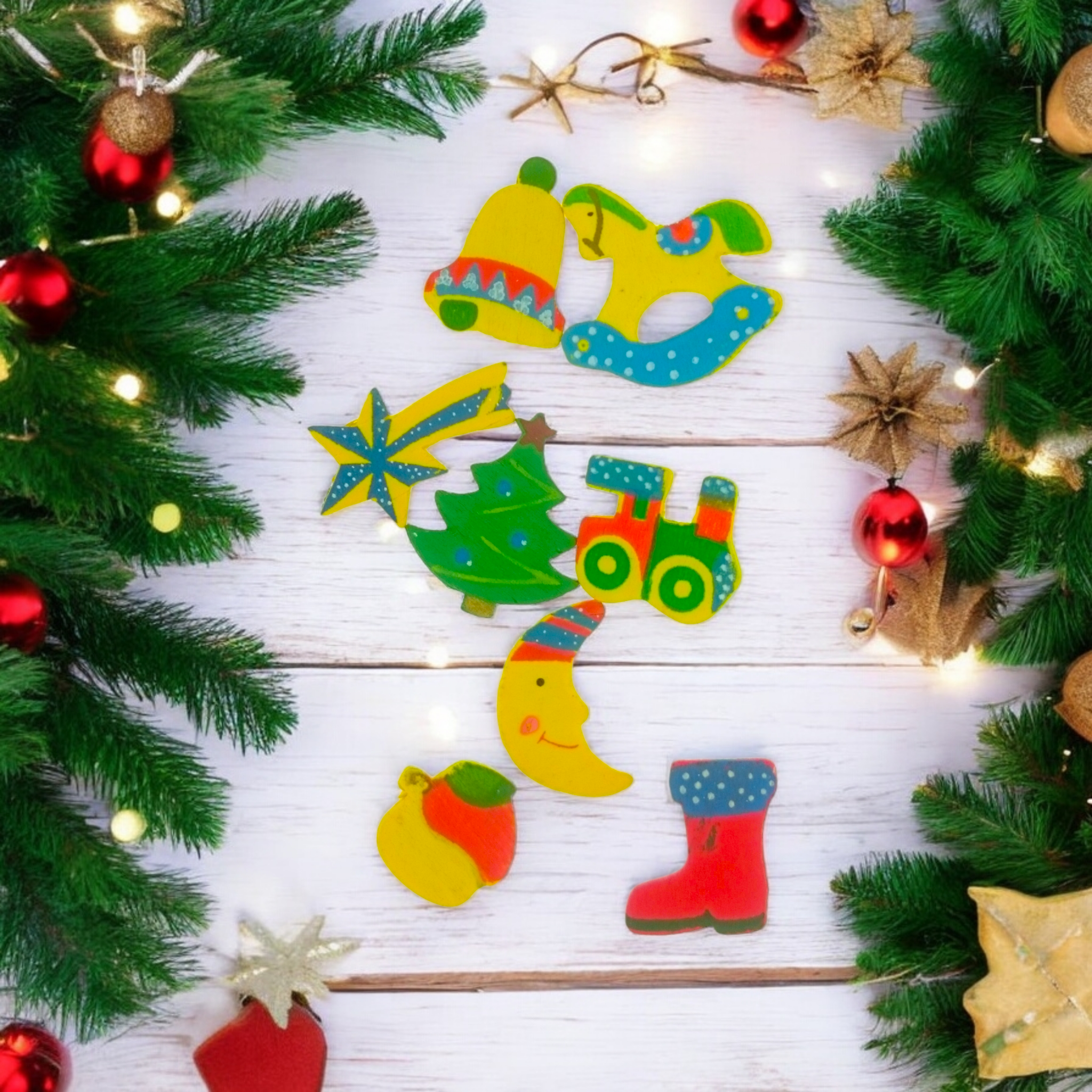 24 Stück Streudeko aus Holz, beidseitig bemalt mit weihnachtlichen Motiven (2–3 cm). Ideal für Bastelarbeiten, Geschenkverpackungen und Dekorationen.