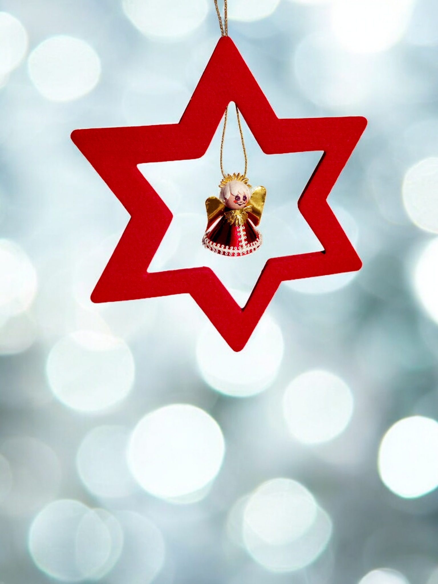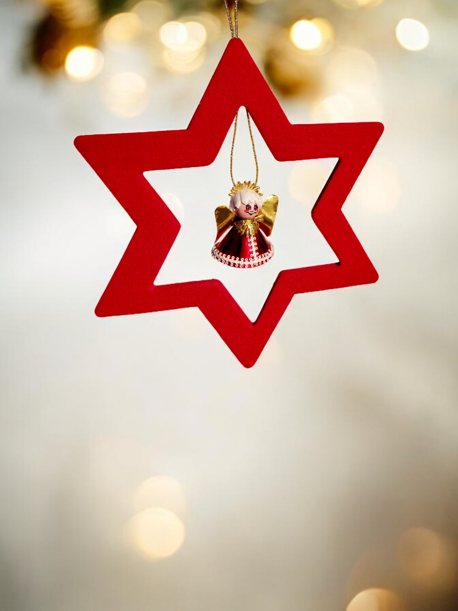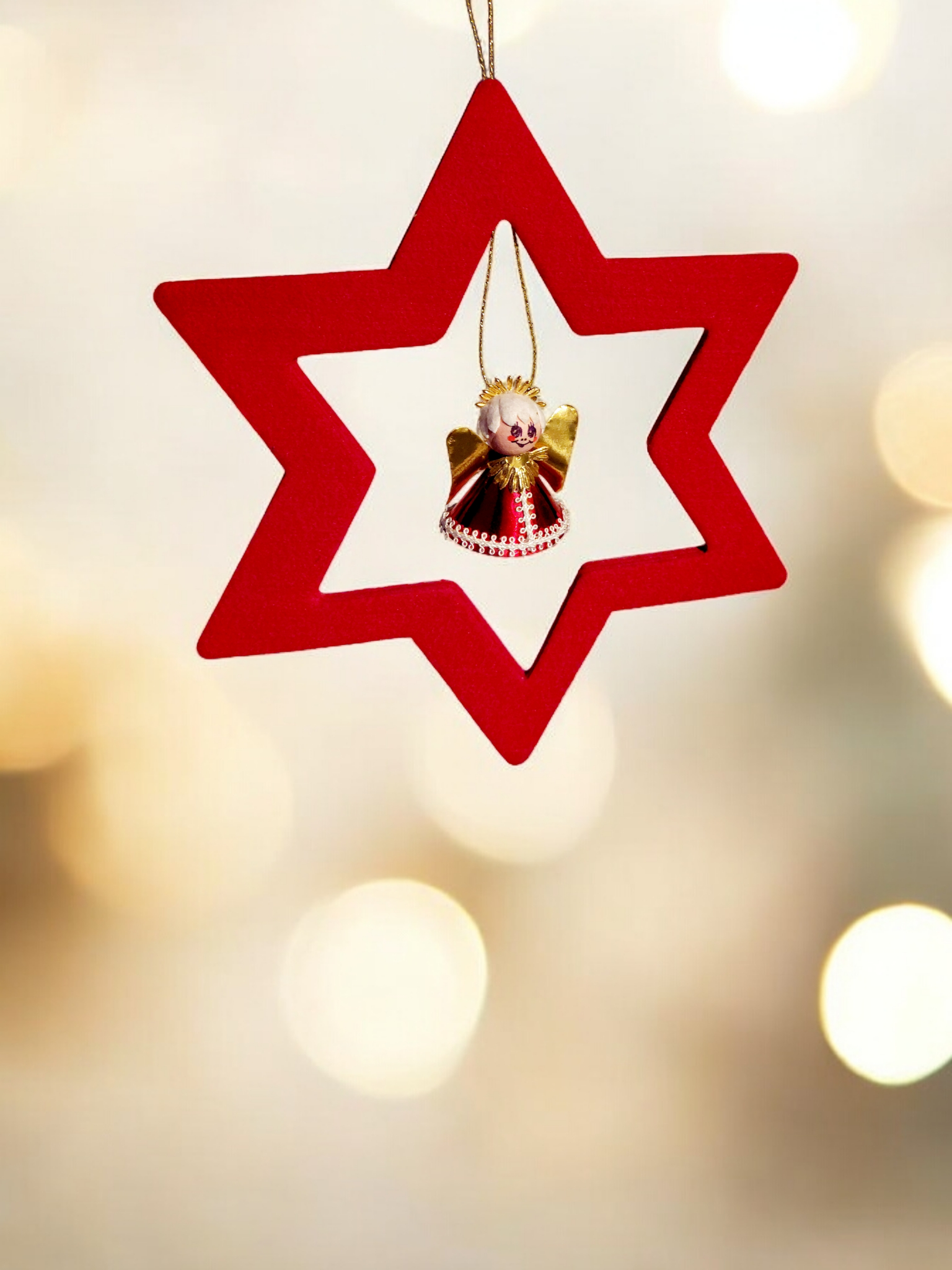 Dieser liebevoll gestaltete Weihnachtsanhänger im 2er Set bringt festlichen Glanz in dein Zuhause. Der große Stern aus rotem Filz umrahmt eine kleine Engel-Figur aus Watte und Papier, die mit goldenen Flügeln und einem roten Gewand verzaubert. Ob als Christbaumschmuck, Fensterdekoration oder Geschenkidee – diese Anhänger sorgen für stimmungsvolle Weihnachtsatmosphäre.