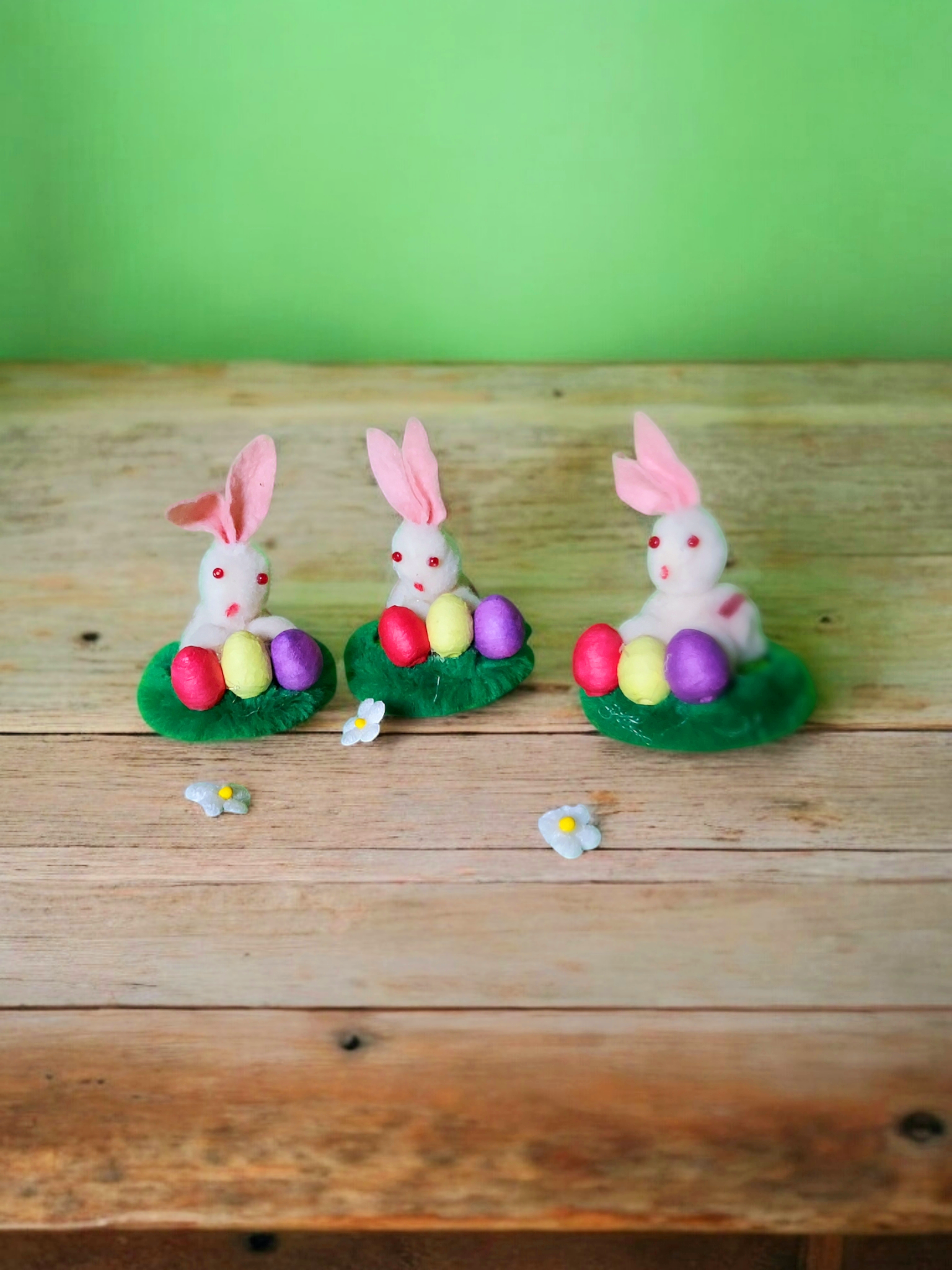 Die Häschen bestehen aus Wolle, Papier, Chenille und Drehwatte.