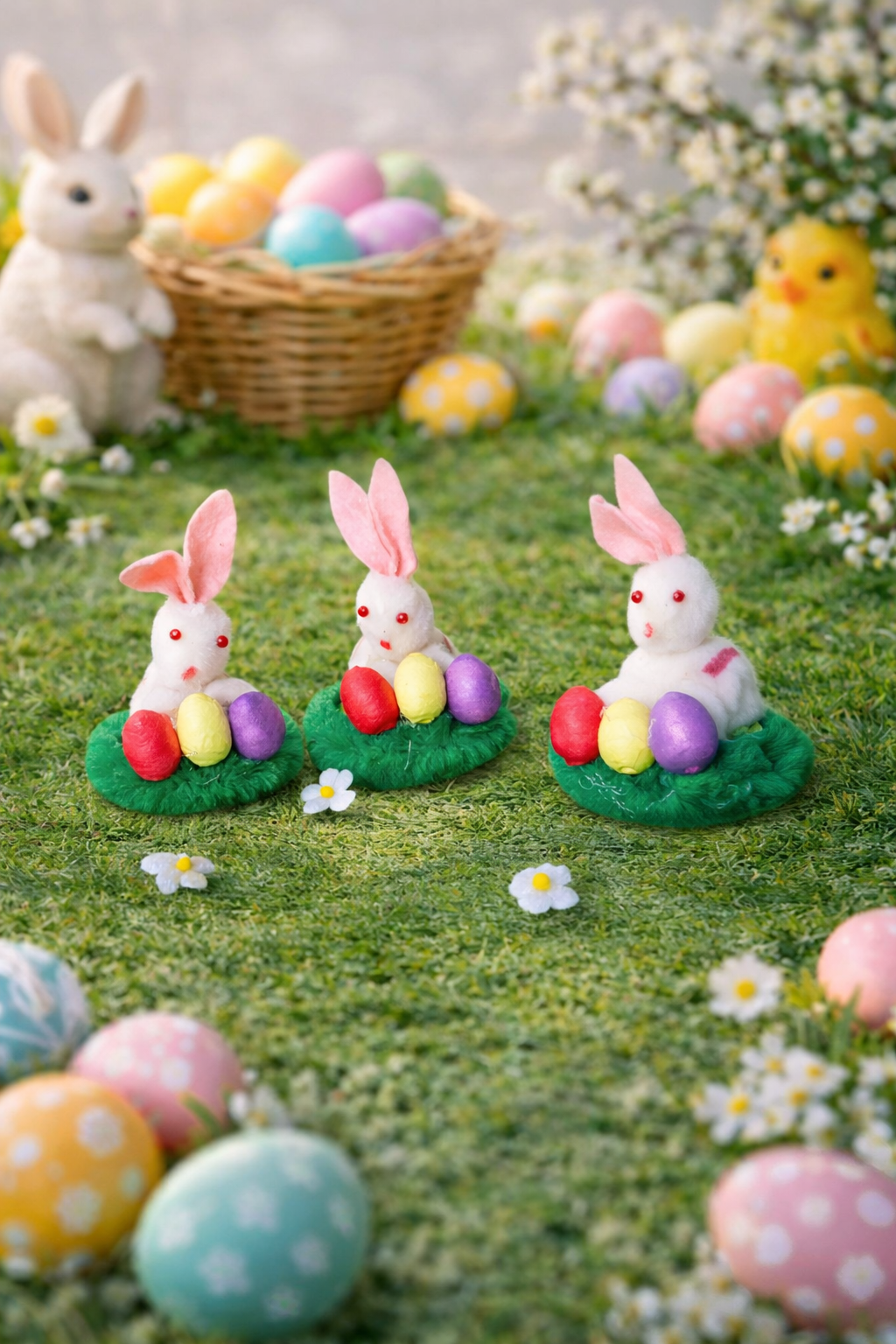 Diese niedlichen Wollhäschen im Osternest bringen sofort frühlingshafte Osterstimmung in dein Zuhause. Mit ihrer liebevollen Gestaltung und der kleinen Größe von etwa 4,5 × 4,5 cm eignen sie sich perfekt als dekoratives Detail für Ostertische, Osternester oder kleine Geschenkverpackungen.